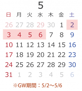 ゴールデンウィーク期間につきまして、下記の通りご案内いたします。